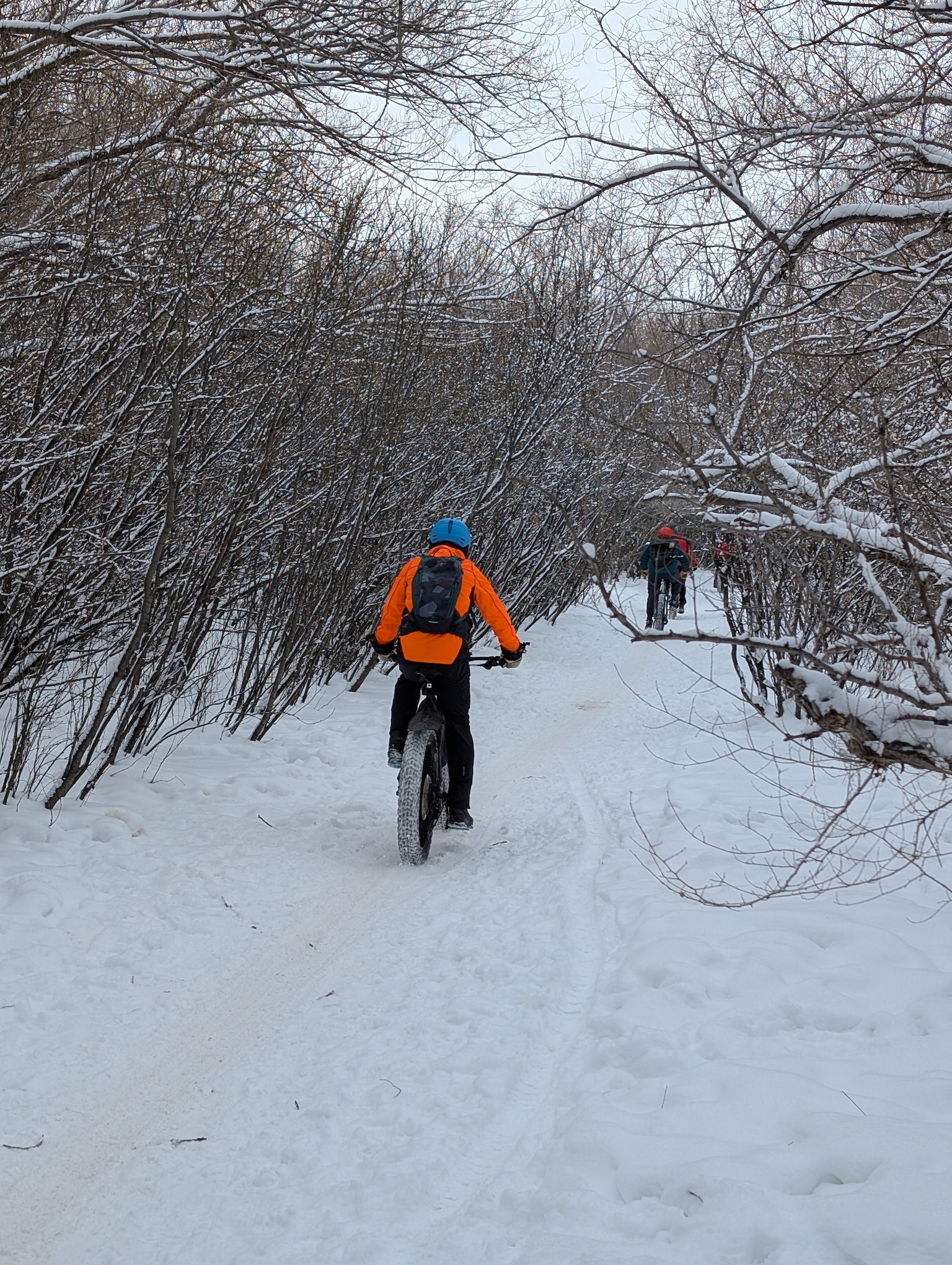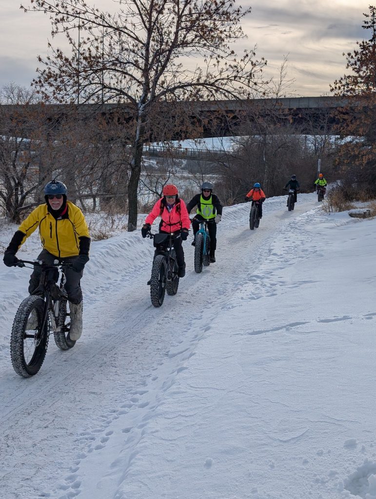 Winter rides start on Nov. 1, 2025 this year so get your fat bike ready. The rides take place each Saturday afternoon at 1pm in conjunction with the Horizon 100 Cycling Club. We will be starting most often from the Nutrien Wonderhub (east side, between the building and the river) but not always. Please see our Facebook page for the most up to date information as we will post the starting location for the week and weather/cancellation information. Please note that other styles of bicycles are allowed for dirt or gravel riding until the trails are snow covered.